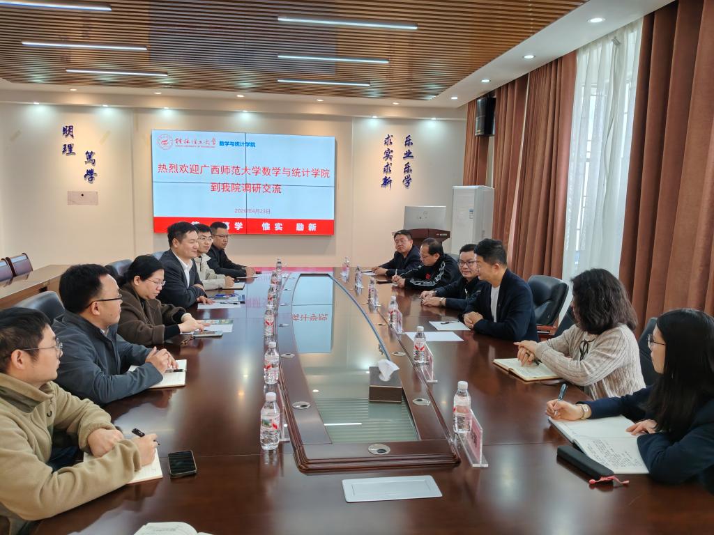 为深化校际合作,互学互鉴促发展,4月23日上午,广西师范大学数学与统计学院党委书记陆锋一行莅临我院开展调研交流。调研座谈会在雁山校区8201会议室举行,我院党委书记江玲、院长蒋远营出席会议,领导班子成员、基础数学教研室主任等参加交流,双方围绕学院发展核心工作展开深入探讨,凝聚发展共识。
