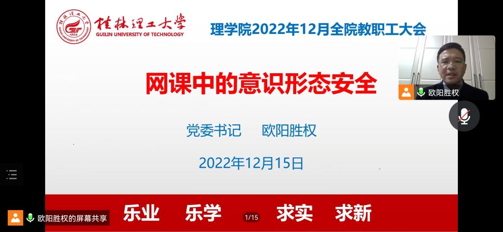 2022年12月15日,理学院意识形态领导小组办公室组成督查小组,对全院各部门贯彻落实中央有关意识形态的决策部署及指示精神的情况,及执行本院内部意识形态工作制度情况开展了线上检查。