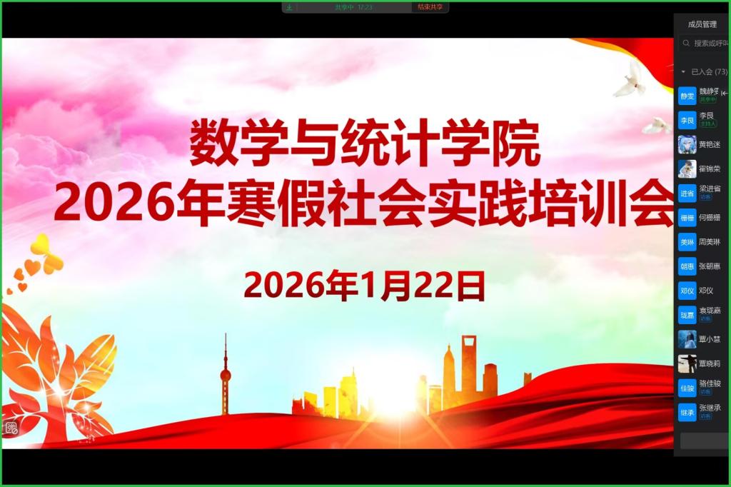 为切实保障寒假社会实践活动安全开展,提升学生安全防范与应急处置能力,1月22日,数学与统计学院召开2026年寒假社会实践安全教育培训会。学院团委书记李艮及各实践团成员参加。 会上,李艮围绕社会实践全流程安全要点展开培训,从出行交通安全、住宿消防安全、个人财产安全及突发情况应急处理等方面进行细致讲解,结合典型安全案例分析风险隐患,强调实践期间必须严格执行每天报备制度,强化团队协作意识,确保每位成员的人身与财产安全。 此次培训会进一步夯实了寒假社会实践的安全基础,明确了实践纪律与责任要求。学院将跟进各实践团进展,做好保障与指导,鼓励更多学子走出校园、服务社会,在实干中成长为担当民族复兴大任的时代新人。 会议照片 (一审:彭娇娇,二审:王洪让,三审:江玲)