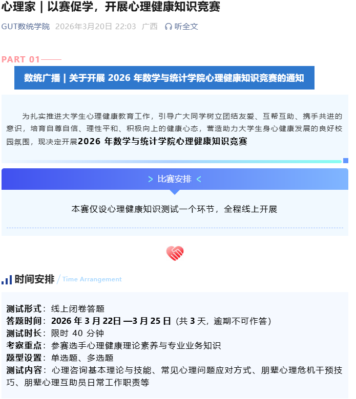 为响应“3·25善爱我”心理健康教育号召,呵护青年学子心灵健康,数学与统计学院紧扣春季心理防护关键节点,开展“3·25善爱我”系列活动,引导全体数统学子善待自我、悦纳自我,筑牢阳光向上的心灵防线。